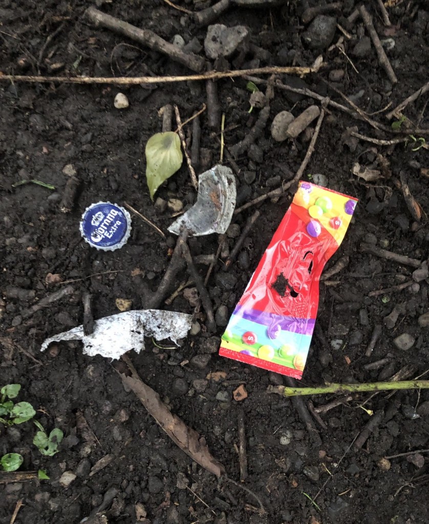 A morning clean of the woods along the Water of Leith. It was pretty clean but we did find the top of a Skittles wrapper, a Corona beer bottle cap, and some bits of plastic.